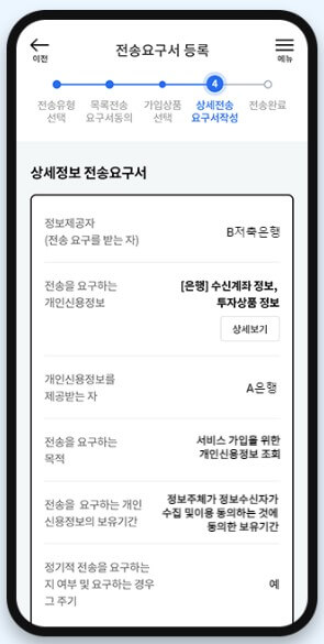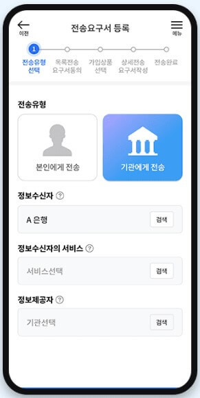 1. 전송유형에서 본인에게 전송을 선택한 후 정보를 제공받을 기관을 검색하여 선택합니다. 2. 가입상품 목록 전송요구서 내용을 확인한 뒤, 개인(신용)정보 수집.이용 동의서와 개인(신용)정보 제공 동의서 내용을 확인하고 동의에 체크합니다. 3. 상세 전송요구서 확인을 위해 통합인증 동의가 필요합니다. 본인확인서비스 이용약관, 개인정보처리동의, 고유식별정보 수집.이용 및 위탁 동의 내용에 동의한 뒤 다음을 선택합니다.