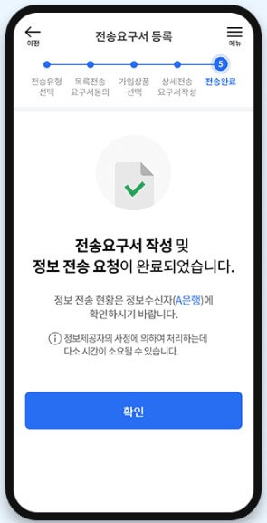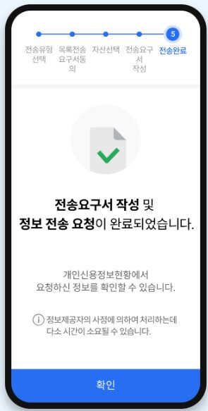 13. 전송요구서 기관에게 전송이 완료되었습니다. [확인] 버튼을 선택하면 전송요구서 관리 화면으로 이동합니다. 마이데이터종합포털 바로가기 MyPDS(나의금융생활) 다운받기 ※ 처음 접하게 되면 이렇게까지 해야 하나 싶을 정도로 생각이 들 수도 있을 것 같습니다. 하지만 모든 기관에서 점차 확대 시행되어 가고 있어 사용 방법에 대한 알아야 되지 않을까 싶습니다.