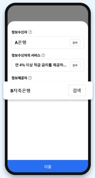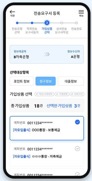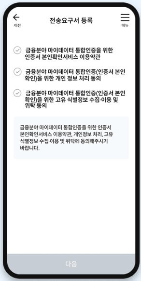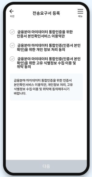 4. 마지막으로 정보제공자 기관을 선택한 뒤 [다음] 버튼을 선택합니다. 5. 가입상품 목록 전송요구서 내용을 확인한 뒤. 개인(신용)정보 수집.이용 동의서와 개인(신용)정보 제공 동의서 내용을 확인하고 동의에 체크합니다. 6. 상세 전송요구서 확인을 위해 통합인증 동의가 필요합니다. 본인확인서비스 이용약관, 개인정보처리 동의, 고유식별정보 수집.이용 및 위탁 동의 내용에 동의한 뒤 다음을 선택합니다.
