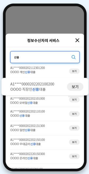 1. 전송유형에서 기관에게 전송을 선택한 후 정보를 제공받을 정보수신자 기관을 검색하여 선택합니다. 기관에게 전송 시에는 본인이 정보수신기관의 서비스에 반드시 가입이 되어 있어야 정보 전송이 가능합니다. 2. 정보수신자의 서비스를 선택하면 정보수신자기관의 서비스 목록이 표시됩니다. 서비스명이나 서비스번호로 검색이 가능합니다. 본인이 가입한 서비스를 선택합니다. 3. 서비스 목록에서 보기 버튼을 선택하면 해당 서비스 정보를 확인할 수 있습니다.