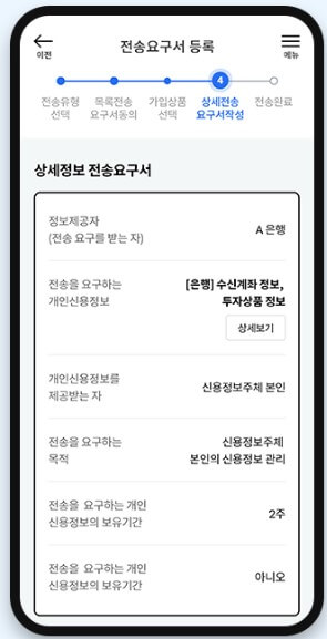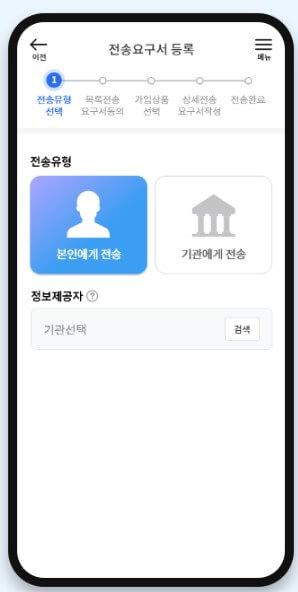 한국신용정보원 마이데이터 종합포털 MyPDS App을 이용한 전송요구서 등록절차를 확인해 보겠습니다. 여기서는 기본이 되는 '본인에게 전송'과 기관에게 전송하는 방법을 알아보도록 하겠습니다.