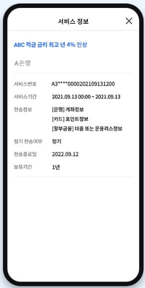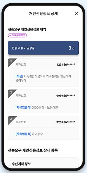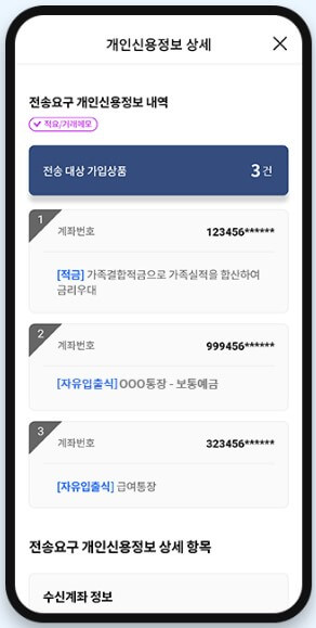 7. 전자서명을 위한 인증 수단을 선택합니다. 기본인증방식을 설정해 놓으면 인증 선택 없이 바로 인증을 진행할 수 있습니다. 8. 가입상품 목록에서 전송받을 가입상품을 선택한 뒤 [다음]버튼을 선택합니다. 신용정보 주체 권리보호 관련 항목이 포함된 상품을 선택하면, 하단에 해당 항목 제공에 동의가 필요합니다. 9. 가입상품 상세정보를 요구하기 위한 상세정보 정송요구서를 읽고 종료시점과 조회기간을 선택한 뒤 [다음] 버튼을 선택합니다.