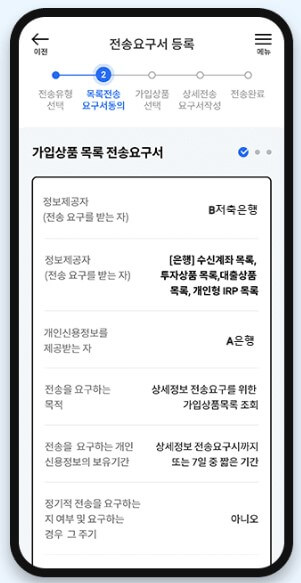 1. 전송유형에서 본인에게 전송을 선택한 후 정보를 제공받을 기관을 검색하여 선택합니다. 2. 가입상품 목록 전송요구서 내용을 확인한 뒤, 개인(신용)정보 수집.이용 동의서와 개인(신용)정보 제공 동의서 내용을 확인하고 동의에 체크합니다. 3. 상세 전송요구서 확인을 위해 통합인증 동의가 필요합니다. 본인확인서비스 이용약관, 개인정보처리동의, 고유식별정보 수집.이용 및 위탁 동의 내용에 동의한 뒤 다음을 선택합니다. 4. 전자서명을 위한 인증 수단을 선택합니다. 기본인증방식을 설정해 놓으면 인증 선택 없이 바로 인증을 진행할 수 있습니다. 5. 가입상품 목록에서 전송받을 가입상품을 선택한뒤 '다음'버튼을 선택합니다. 신용정보 주체 권리보호 관련 항목이 포함된 상품을 선택하면 하단에 해당 항목 제공에 동의가 필요합니다. 6. 가입상품 상세정보를 요구하기 위한 상세정보 정송요구서를 읽고 종료시점과 조회기간을 선택한뒤 '다음' 버튼을 선택합니다. 7. 전송을 요구하는 개인신용정보 항목에서 [상세보기]를 선택하면 전송받을 가입상품의 상세정보를 확인할 수 있습니다. 8. 상세 전송요구서 확인을 위해 통합인증 동의가 필요합니다. 본인확인서비스 이용약관, 개인정보 처리동의, 고유식별정보 수집.이용및 위탁 동의 내용에 동의한 뒤 다음을 선택합니다. 9. 전자서명을 위한 인증 수단을 선택합니다. 기본인증방식을 설정해 놓으면 인증 선택 없이 바로 인증을 진행할 수 있습니다. 10. 전송요구서 본인에게 전송이 완료되었습니다. [확인] 버튼을 선택하여 전송 요구서 관리 화면으로 이동합니다. 마이데이터종합포털 바로가기 MyPDS(나의금융생활) 앱 다운받기 ≫ 기관에게 전송하기